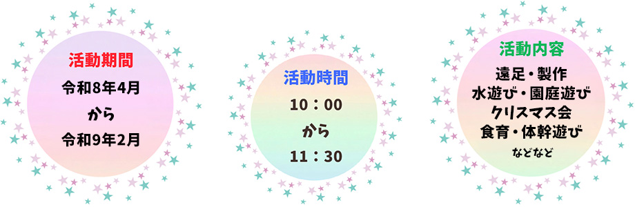 | 対象年齢 | 満1歳のお誕生日を迎えた方~幼稚園ご入園まで |
